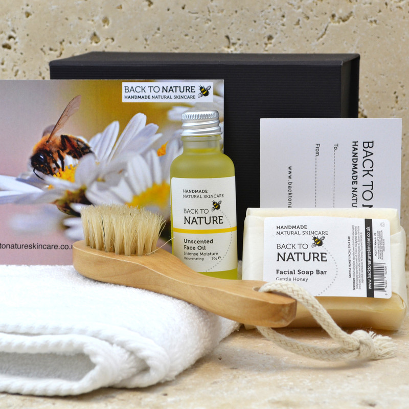 An unscented gift pack containing an unscented facial oil, honey facial soap and a facial scrub brush.